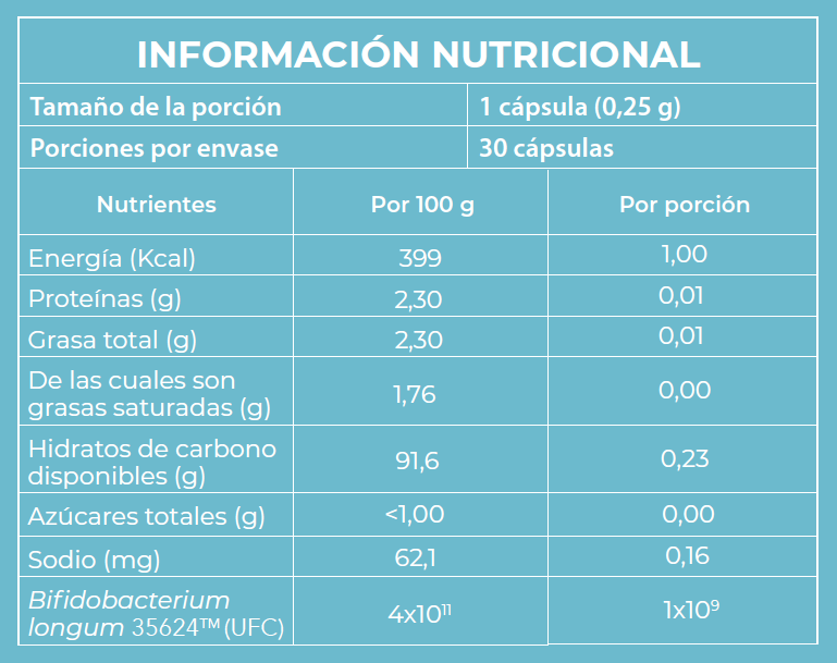 Bifidobacterium Longum 35624™ Otros ingredientes: Almidón de maíz, estearato de magnesio.